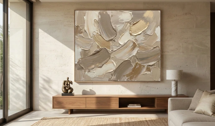 A large hand-painted abstract canvas featuring rich acrylic textures and a neutral luxury palette of beige, taupe, and soft gold. Designed for modern Indian luxury interiors, this premium wall art adds depth, elegance, and a refined contemporary statement.