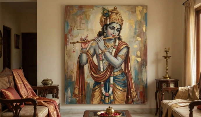 Hand-painted devotional artwork blending traditional Indian spirituality with modern elegance, finished in oil/acrylic textures and subtle gold accents. Perfect for premium Indian home interiors, creating a calm, divine, and timeless spiritual atmosphere.